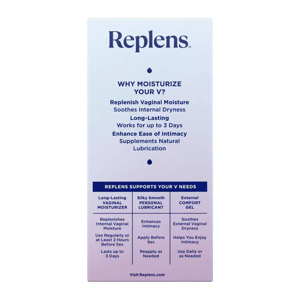 Replens™ vaginal moisturizer uses advanced bioadhesive polymer technology to provide long-lasting hydration, reduce dryness, maintain healthy pH, and soothe irritation. Hormone- and fragrance-free, clinically recommended