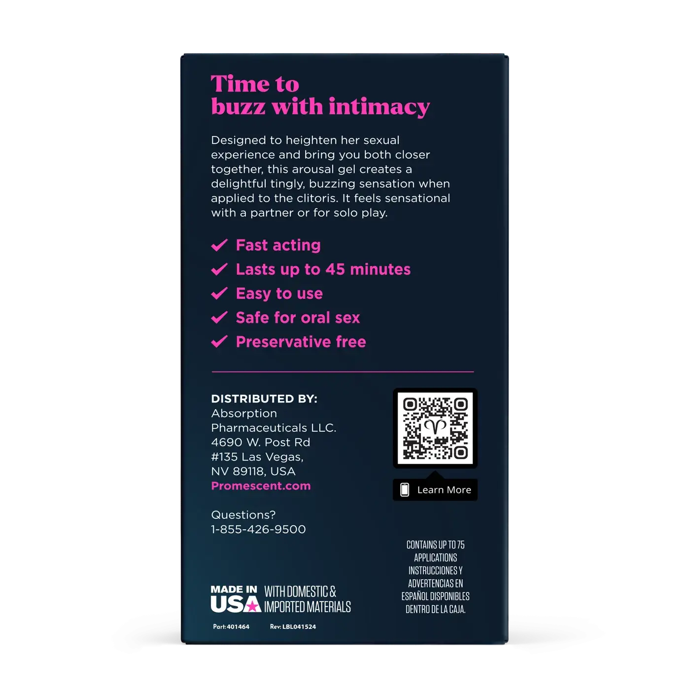 Promescent Buzzing Female Arousal Gel নারীদের উত্তেজনা, সংবেদনশীলতা ও আনন্দ বাড়াতে তৈরি। দ্রুত শোষিত হয় এবং ঝিলমিল অনুভূতি দেয়, যা আত্মবিশ্বাস ও অন্তরঙ্গ সুখ বৃদ্ধি করে।