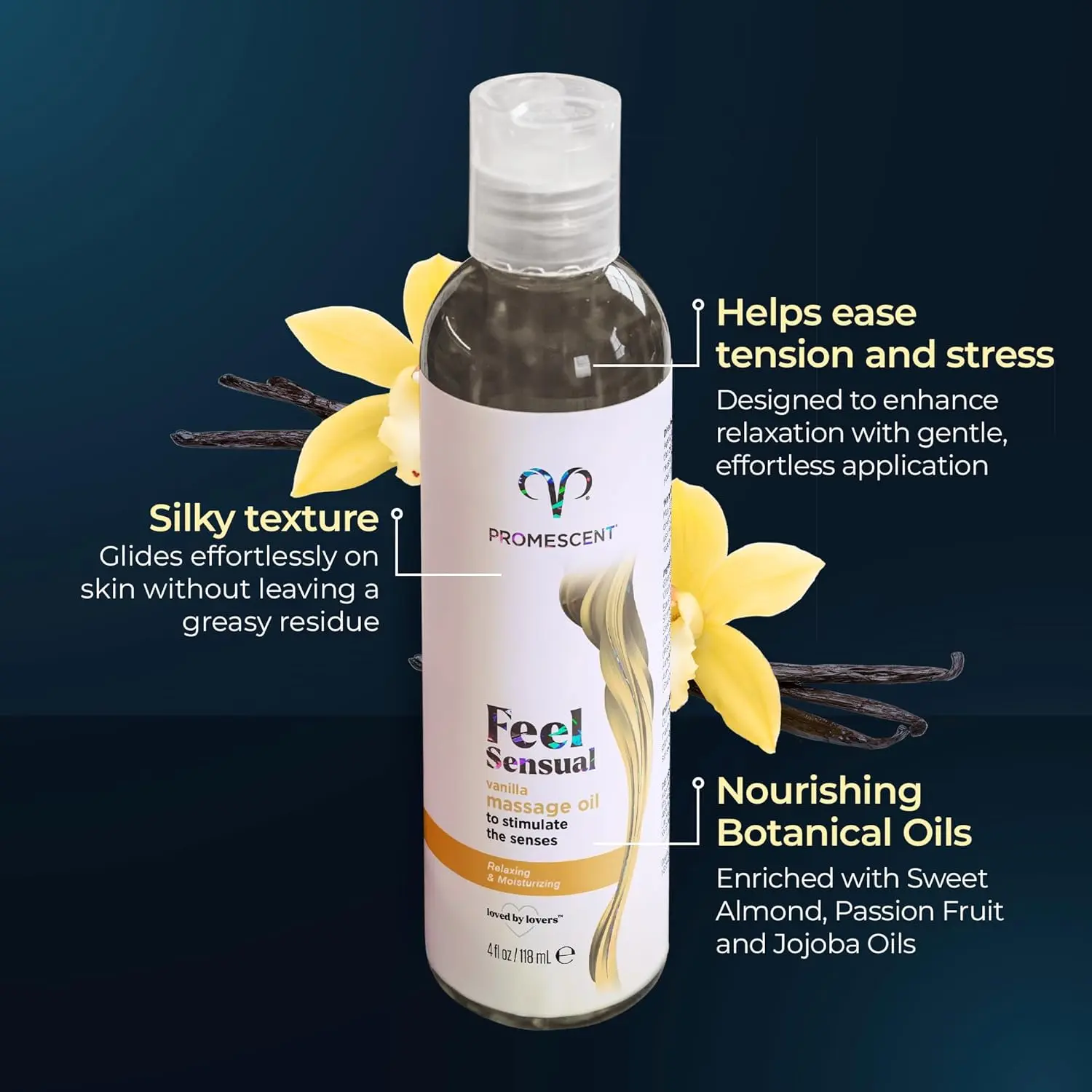 Ignite passion and unwind with Promescent® Vanilla Massage Oil. Infused with a warm, sweet vanilla aroma, this silky body oil enhances touch, relaxes muscles, and creates a sensual experience for couples. Perfect for intimacy, relaxation, or everyday skin nourishment.